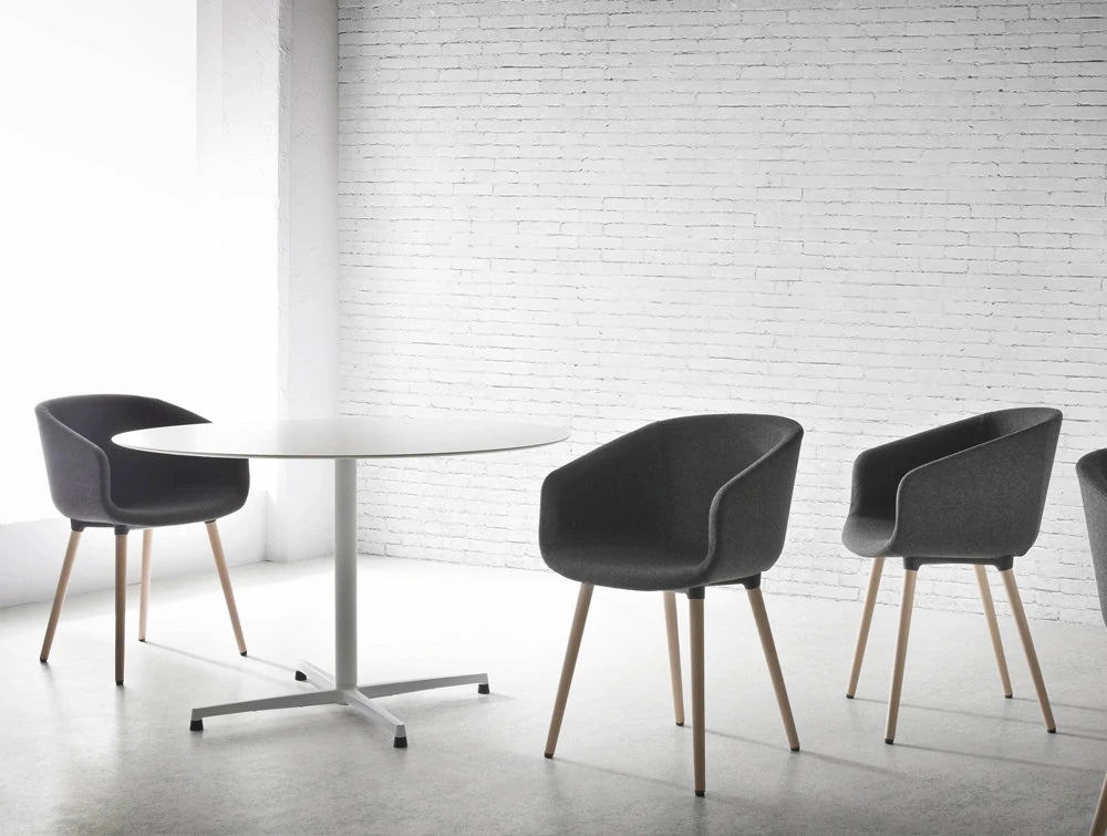 The Basket Canteen and Breakout Armchair is available in many base finishes including a Wooden Leg base design. This multi-purpose chair is offered in a wide range of colour finishes including various fabrics and eco-leather.