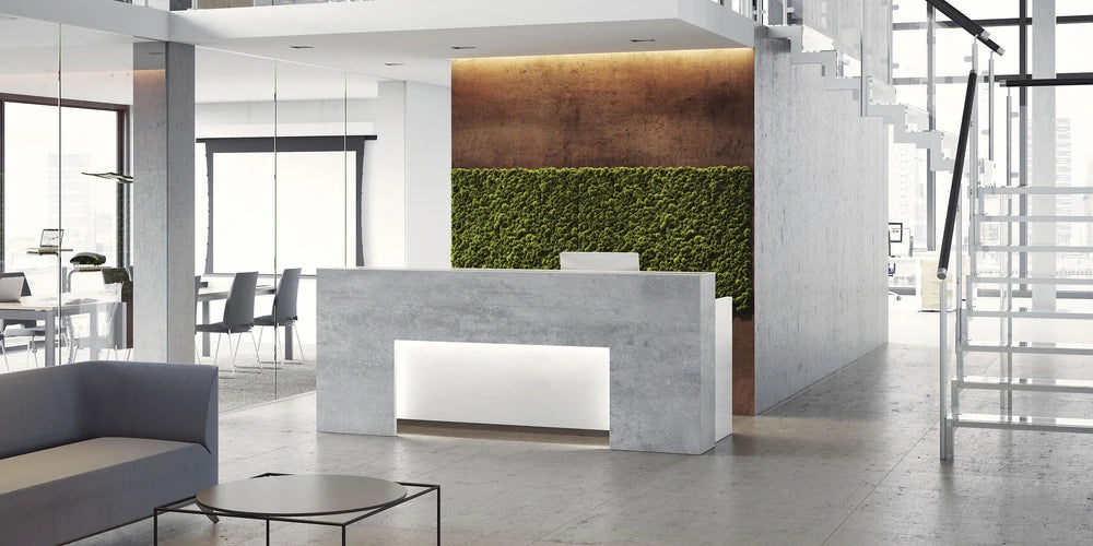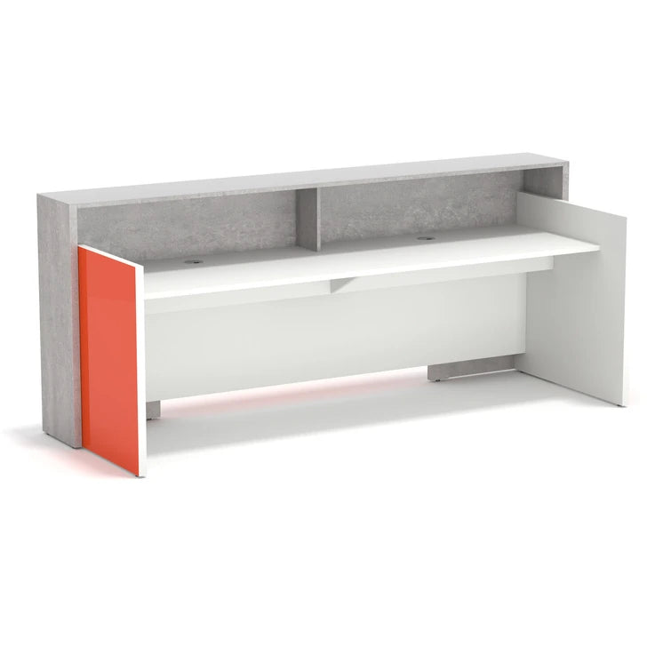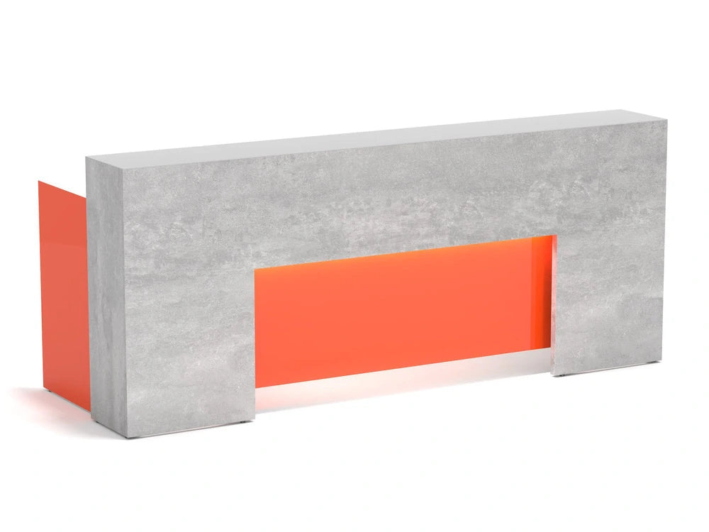 BLOCK reception unit draws attention with its remarkable appearance, and at the same time it creates the atmosphere of concentration. The front of the counter is composed of two layers. The first is a strong frame with a colour of concrete. Behind it, there is a colourful surface illuminated by RGB LED lamps. Light emanating from inside the frame underlines the depth of the structure. The lamps have the function of generating a wide range of colours. They can be easily controlled by a remote control.