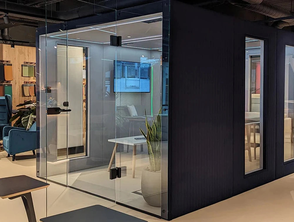 The Bob Rooms collection combines comfort and privacy with its beautifully upholstered large panels and soft rounded corners. Designed to absorb unwanted sound, it enhances privacy in any space. Customise with up to 10 glass windows (4 on the left, 4 on the right, and 2 on the back) to suit your needs. Note that a wall-mounted TV bracket can only be added to an upholstered panel, not a glass window wall.