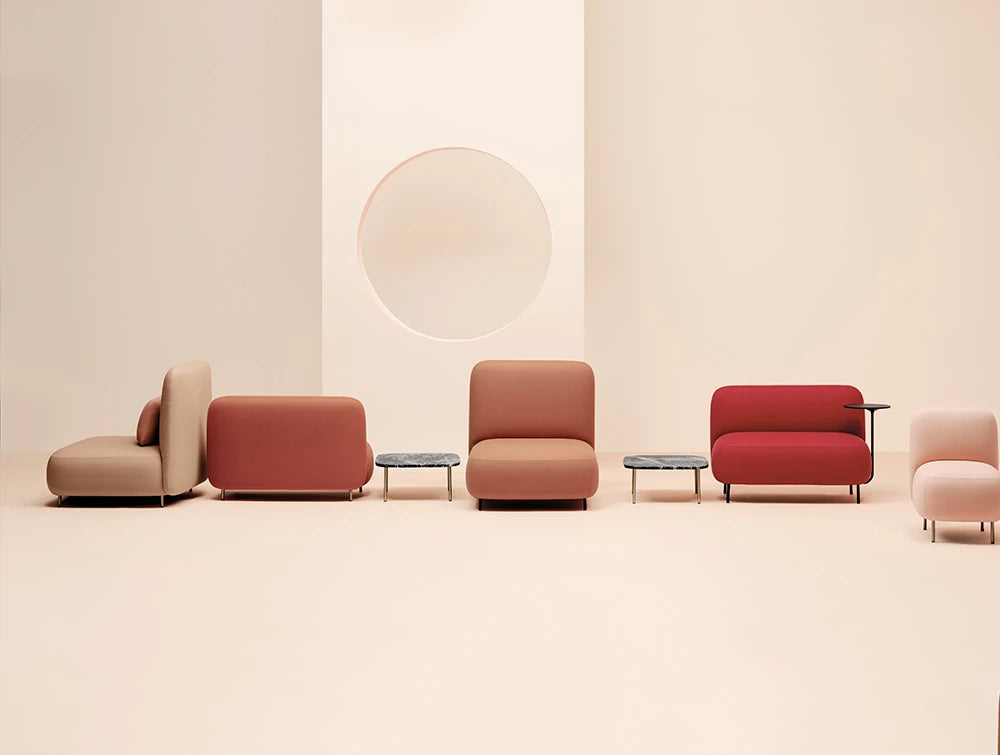 The Buddy collection made up of contemporary and versatile elements, is featured by a contrast between the bold volumes of the seat and the slender lightweight frame. Upholstered chaise-longue in polyurethane injected foam and steel tube frame. The rounded shape of the pouffe with a generous and comfortable upholstery is supported by for thin and rigorous legs. These make the pouffe extremely functional and visually lift the volume from the ground.