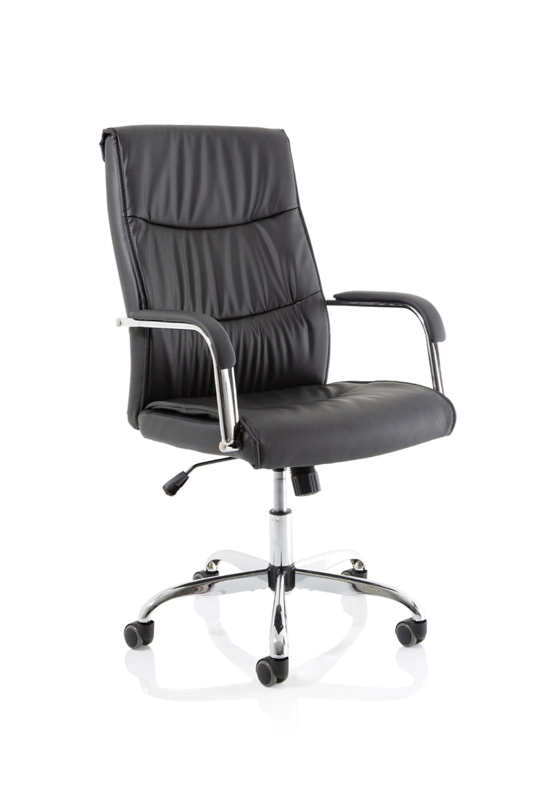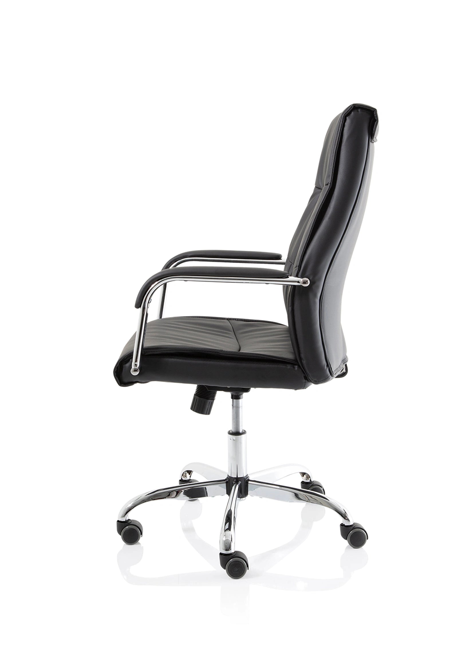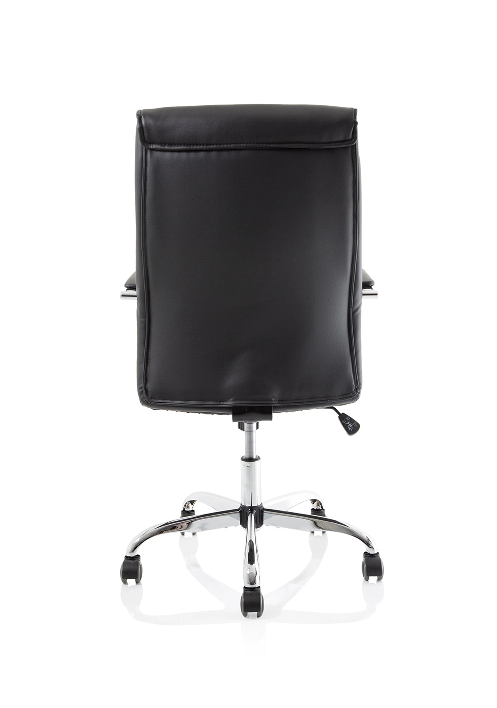 Luxury at a fraction of the usual cost. This high back Carter chair in faux leather has stitch detailing, deep foams and a padded armrest on a chrome frame. A clear case of Get Carter.