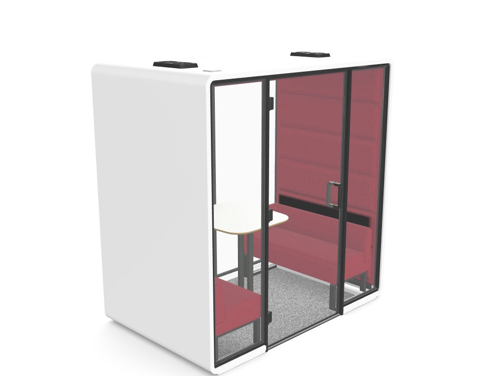 Specification: Upholstery - Red, Seats - Seats, Seat Upholstery - Red, Body Finish - White, Tables - Table, Table Top Finish - White, Glass Finish - Clear PRZ, Occupancy Signal - Required, Hush Assistance - Required, Booking Screen - Not Required, TV Mounting - Not Required, Access Point 1 - Power Socket, Access Point 2 - HDMI, Access Point 3 - USB A+C 25W, Access Point 4 - Power Socket, Door Position - Closed