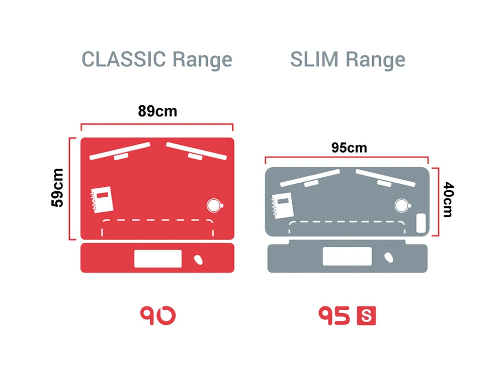 DESK 90 Desk Riser is the medium size model from our best-selling CLASSIC sit-stand range. Designed by experts to incorporate our unique Smooth-Action gas spring for smoother up/down movement to 15 adjustable heights. Featured on BBC TV, the DESK 90 standing desk has been demonstrated to improve workplace health as it effortlessly transitions between sitting and standing positions. DESK 90 is 89cm wide and fits perfectly with workstations using double monitors or when placed on a standard-sized desk.
