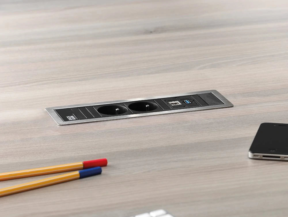 The Power Frame provides complete power strips for your office desk, and features compact dimensions. It's quick to install and versatile to use.