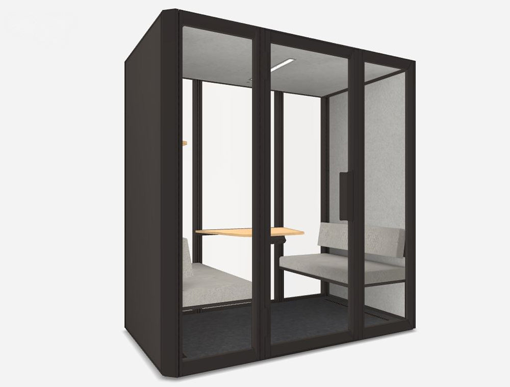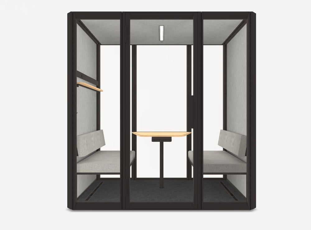An acoustic oasis for one. Step inside for a quick call, video meeting, or deep work session to come up with the next big idea. Use extra add-on sets for even more functionality. Add bookshelves or a whiteboard anywhere and at any height, inside or out. Your office needs a slight refreshment? Simply reconfigure your add-ons. Its walls can be either black or white, but Jetson is always green at its core. Several innovations make it the most earth-friendly pod on the market.