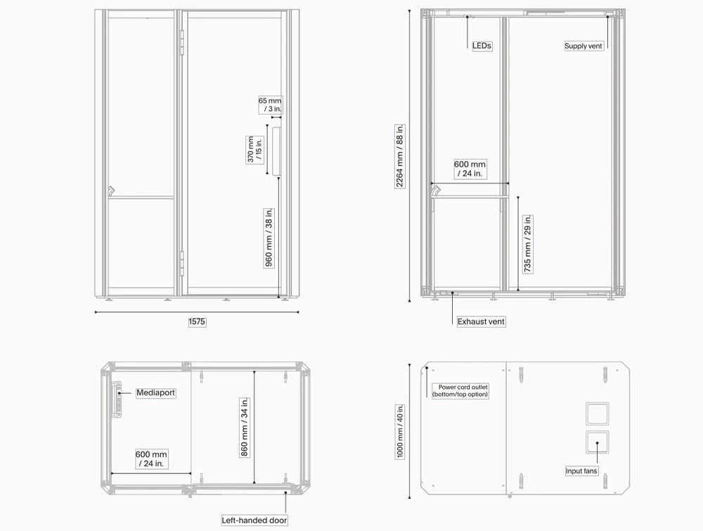 A solo pod designed to maximise concentration, offering high B-class sound insulation and effective ventilation with 365 m³/h airflow. The Jetson M1 features a wide, ergonomic work desk and spacious interior, ideal for installing a full-size office chair. The most earth-friendly acoustic pod on the market