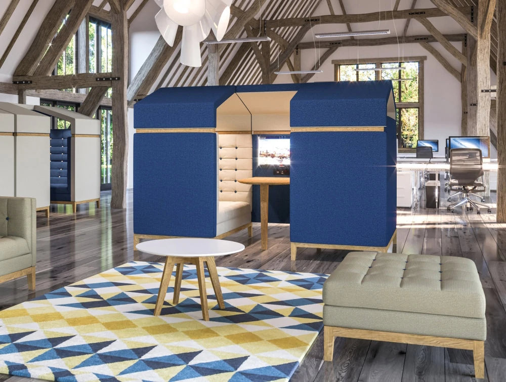 The Jig Cave office pod provides a private space for office meetings. Fully customisable with acoustic walls, table top & monitor mount. Can be configured with a vast choice of upholstered finish & comes with overhead LED lighting.