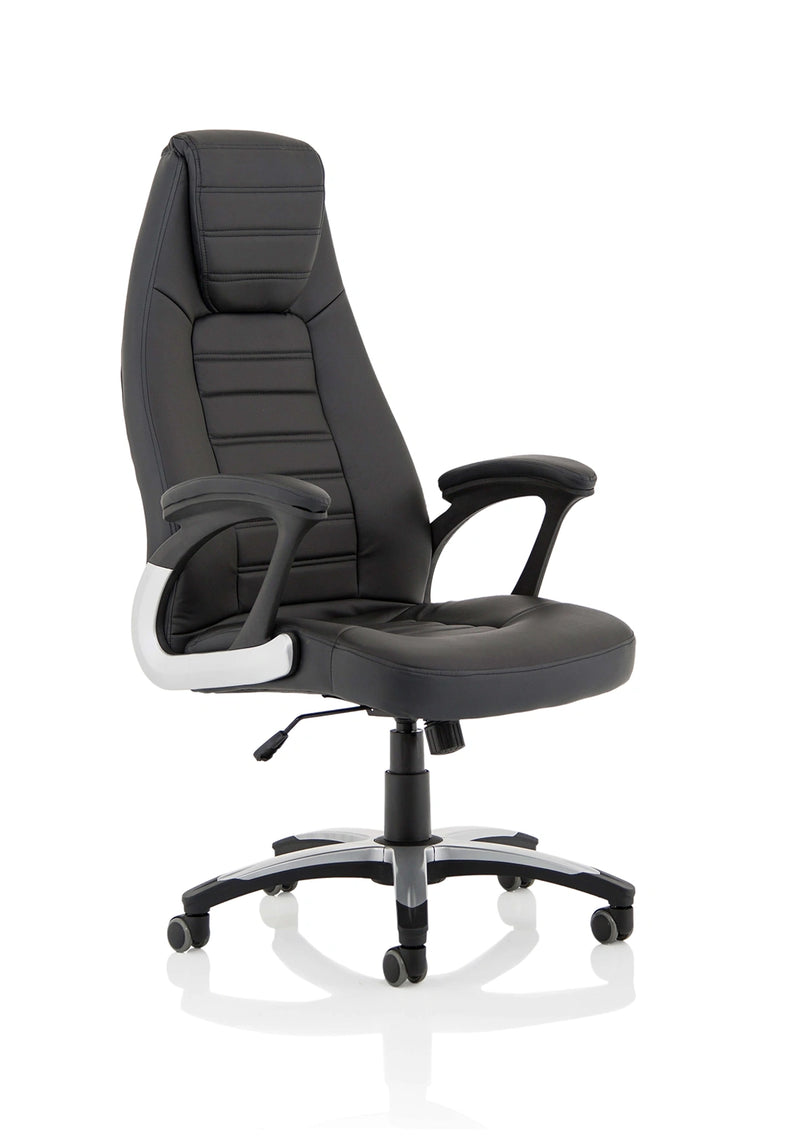 This ingeniously designed chair with detail stitching, integral lumbar support, auto-tilting action and fully upholstered arms is everything the modern executive craves from their seating solution. A chair for every user and every location it has upholstered pads for extra comfort and stunning good looks for the modern office. This highly functional exec chair is finished in wipe clean leather look upholstery that is soft to touch.