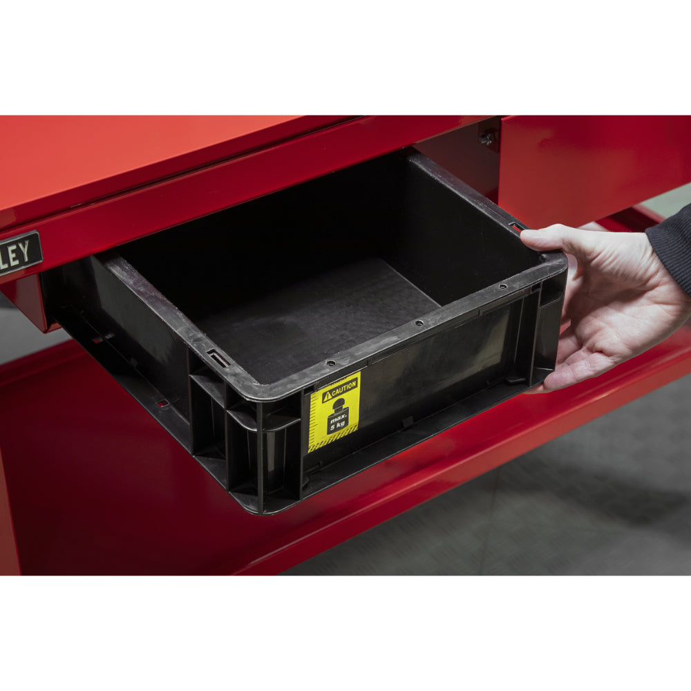 Heavy-duty mobile workbench designed for engine repair and workshop use, featuring sturdy steel construction with a corrosion-resistant powder-coat finish. The angled worktop with integrated drain guides fluids into a removable polyethylene container, while a height-adjustable bottom shelf, lockable drawer and four swivel castors (two locking) ensure practical, mobile and secure storage. Size: 1200 × 640 × 872 mm, capacity up to 250 kg.