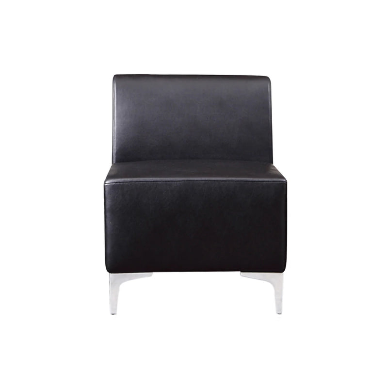 Modular Middle Sectional Sofa in Black Faux Leather is available in single, two or three-seater and modular options. Suitable for any reception or waiting area. It is a low back faux leather modular sofa and chrome legs. The two components create a variety of layouts. Fixing clips are included and can be removed for aesthetics.