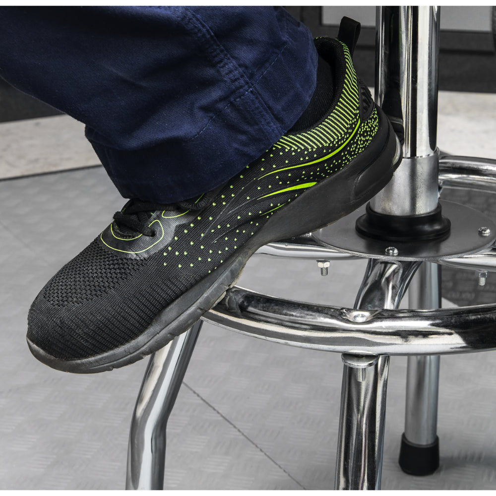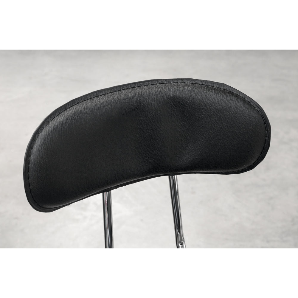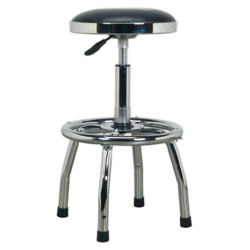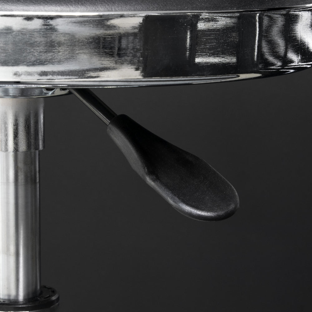 Heavy-duty pneumatic workshop stool built for mechanics and industrial workspaces. Featuring a four-leg steel frame with polished chrome finish for corrosion resistance, a robust Ø32 mm strengthening ring that doubles as a foot-rest, a large Ø365 mm swivel seat that rotates a full 360°, and pneumatic height adjustment from 695 mm to 815 mm - providing ergonomic support and mobility in demanding workshop environments.