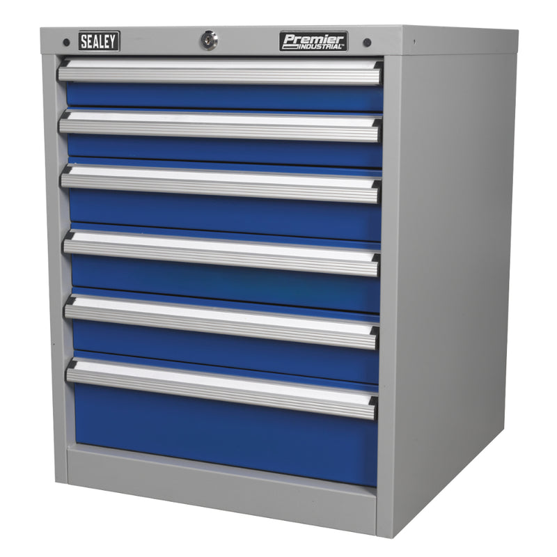 Industrial-grade 6-drawer storage cabinet engineered for professional workshop use. Features heavy-duty ball-bearing drawer slides rated up to 100kg, fixed and cross-dividers for bespoke organisation, and a high-security lock with two coded keys. Its compact size (565 × 580 × 700 mm) makes it ideal for under-bench placement or standalone use in workshops, garages or trade environments.