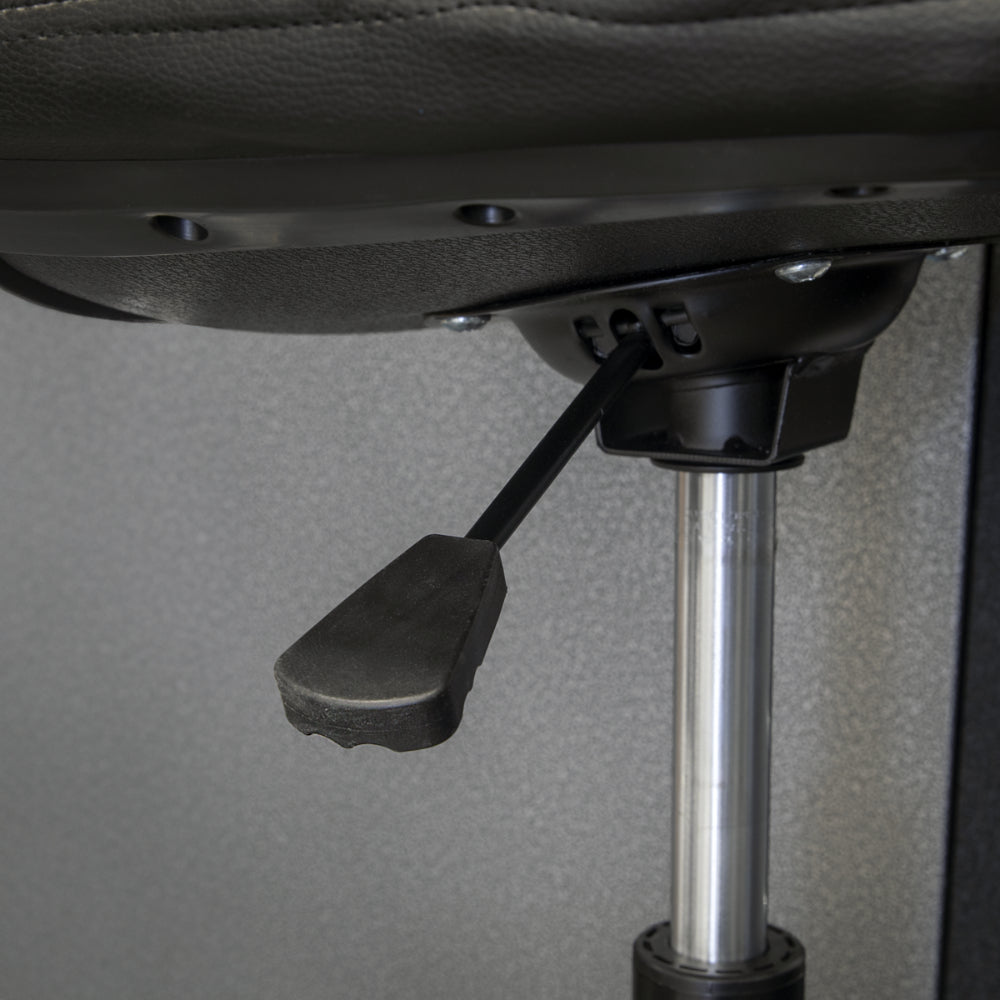 Heavy-duty pneumatic workshop stool with 4-leg steel construction and black powder-coat finish. Adjustable height from 660 mm to 800 mm via a pneumatic lift. Fully 360° swivel padded seat with high-back support and a reinforced ring base that doubles as a foot-rest. Rated to 150 kg capacity - ideal for professional garages and industrial workstations.