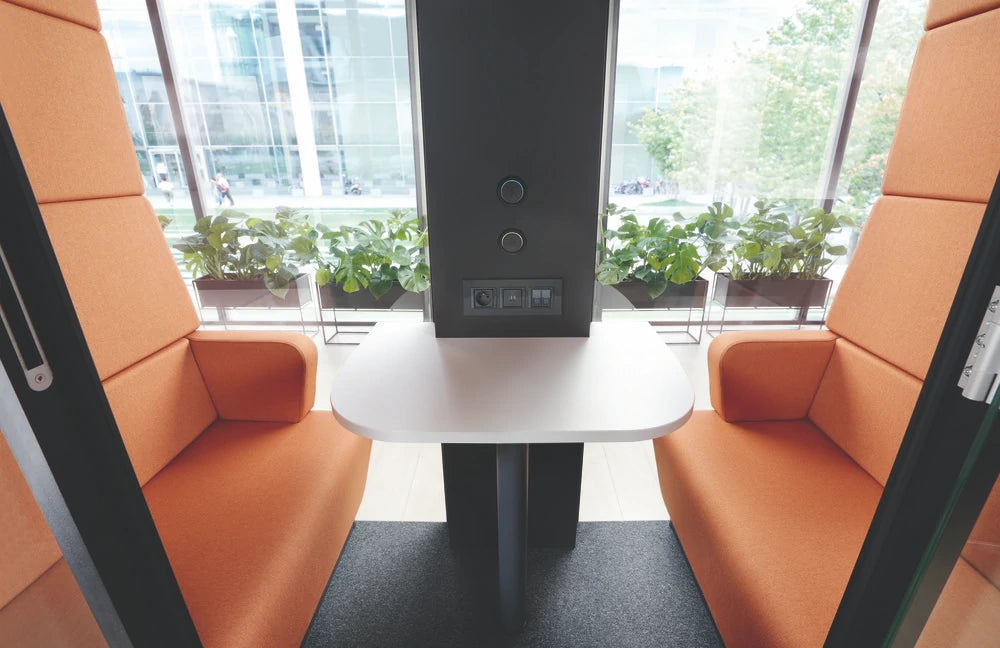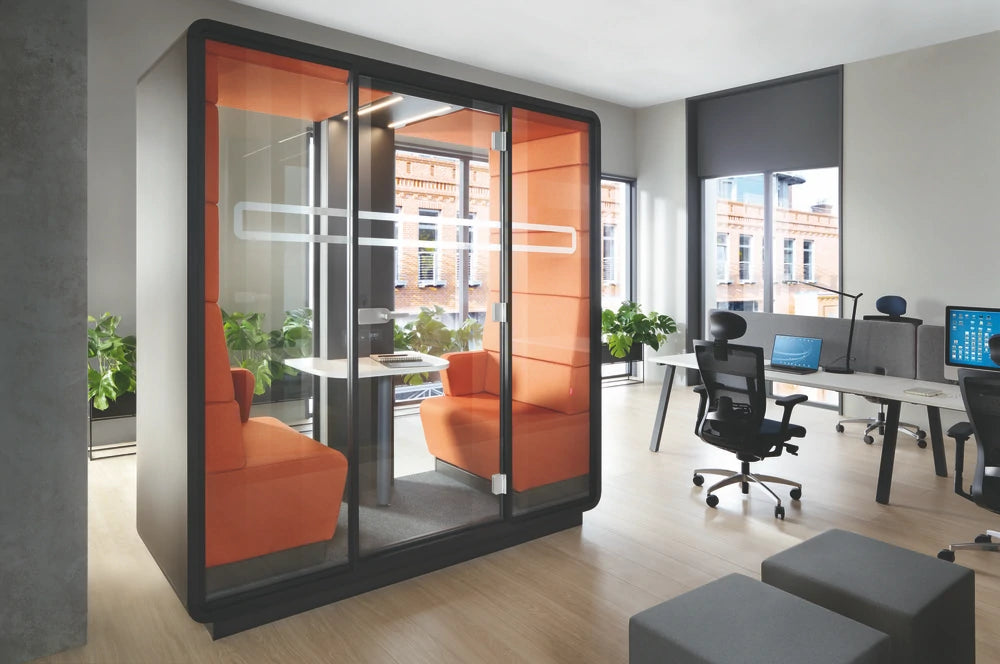 HushMeet is a large meeting booth made by conjoined modules. A team can simply add or remove these modules to expand or scale down the pod and modify their layout without creating any waste, disruption, or cost all within one workday. HushMeet meeting pod has been created for change, so it adapts by design!