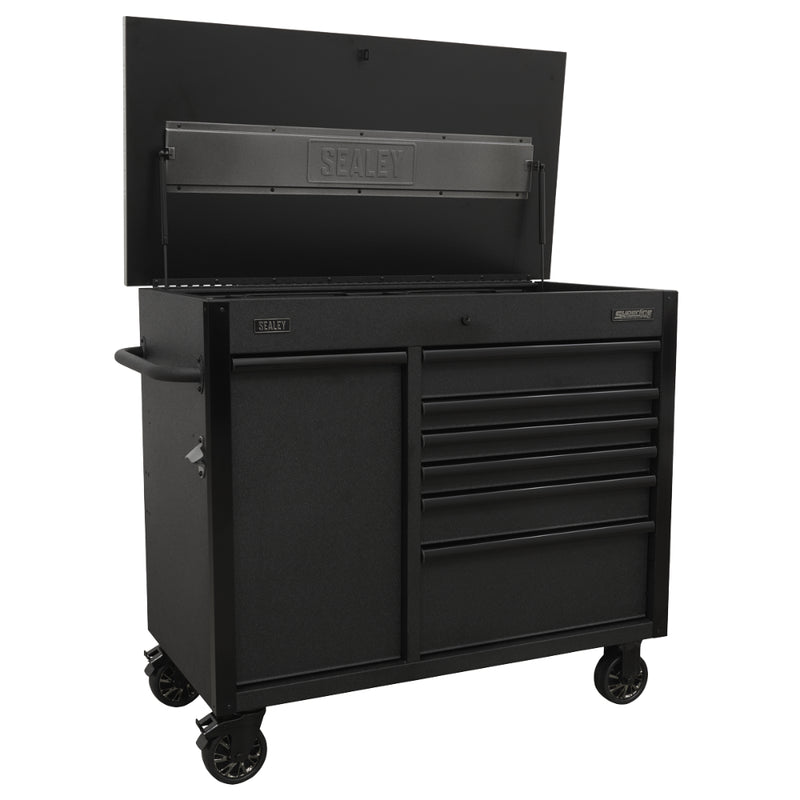 A robust 1120 mm-wide mobile tool cabinet with heavy-duty steel construction, steel inner walls and full-height locking mechanism. It features 45 mm ball-bearing drawer slides for heavyweight items, soft-close drawers, a dedicated power-tool charging drawer with 230 V and USB sockets, four Ø125 mm castor wheels (two swivel with brakes) and a flip-top work surface - ideal for professional workshops.