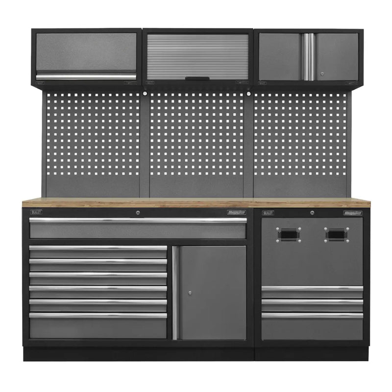 Package includes: APMS53 - Modular Wall Cabinet 680mm, APMS54 - Modular Wall Cabinet Tambour Front 680mm, APMS65 - Modular Wall Cabinet 2 Door 680mm, APMS64 - Modular Floor Cabinet 7 Drawer 1360mm, APMS63 - Modular Reel Cabinet 680mm, APMS50BP - Modular Back Panel 615mm (x3), APMS50UCD - Modular System Double Upright Connector (x2), APMS50UCS - Modular System Single Upright Connector (x2), APMS50WC - Pressed Wood Worktop 2040mm.