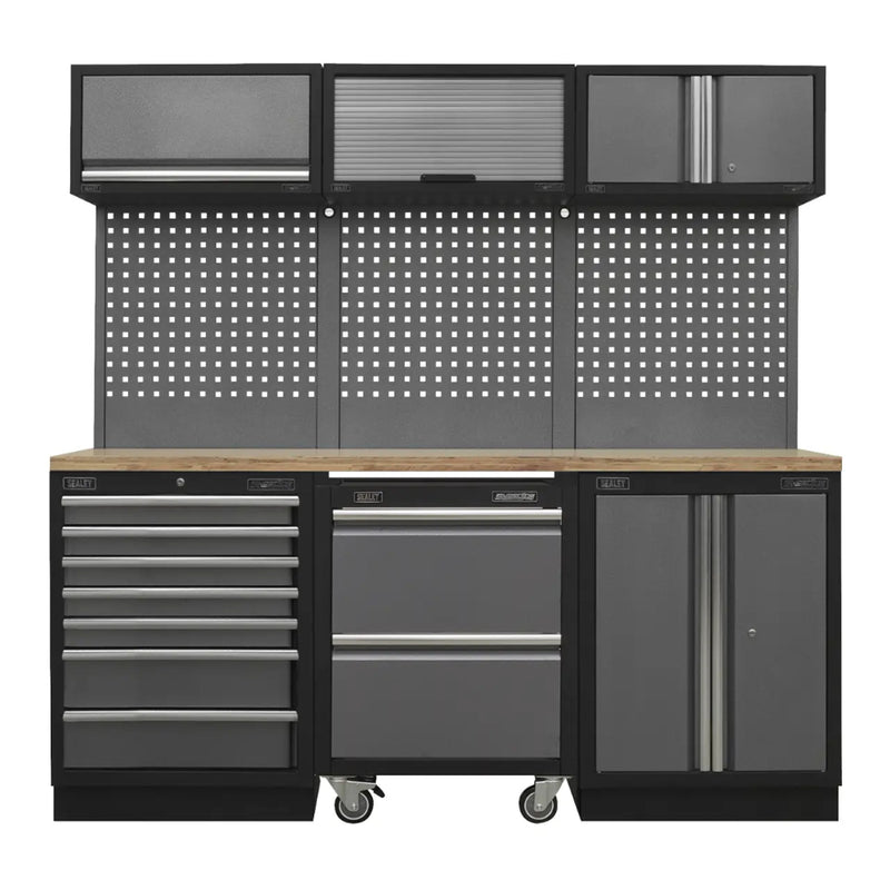 Package includes: Model No. - Description, APMS53 - Modular Wall Cabinet 680mm, APMS54 - Modular Wall Cabinet Tambour Front 680mm, APMS66 - Modular Mobile Workshop Trolley, APMS50BP - Modular Back Panel 615mm (x3), APMS62 - Modular Floor Cabinet 7 Drawer 680mm, APMS52 - Modular Floor Cabinet 2 Door 680mm, APMS65 - Modular Wall Cabinet 2 Door 680mm, APMS50UCD - Modular System Double Upright Connector (x2), APMS50UCS - Modular System Single Upright Connector (x2), APMS50WC - Pressed Wood Worktop 2040mm.