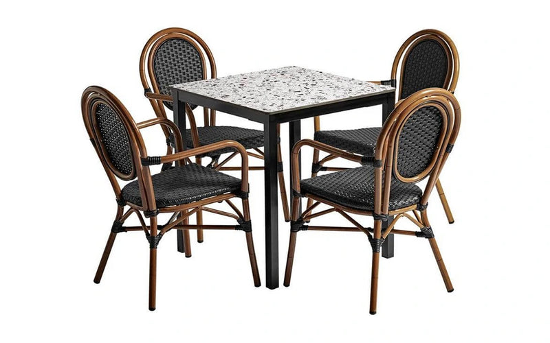 High-quality dining set package 4 Time Armchairs 1 Extrema Terrazzo square table. Very sturdy design dining table. Base powder coated black for outdoor use, complete with high quality, hard-wearing EXTREMA top. It may also be used internally if required. Beautiful wicker quality weave, Ideal for all outdoor occasions. Aluminium cane effect frame, for outdoor use.