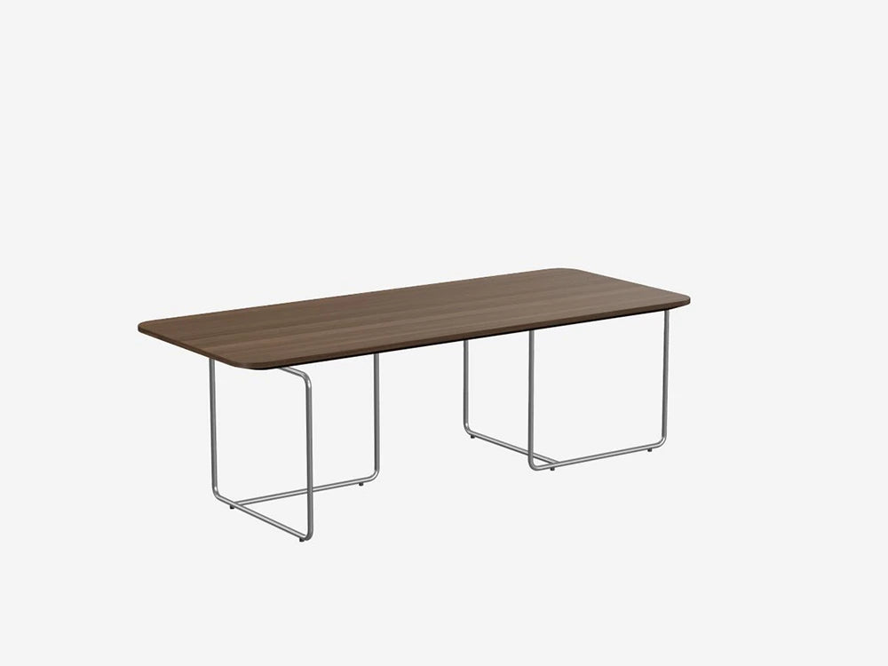 Collection of tables with characteristic oval edges of the table top combined with a square Sectional frame varnished in black or grey. Table top is covered with modified oak veneer in three colours: milk, coffee or cocoa.
