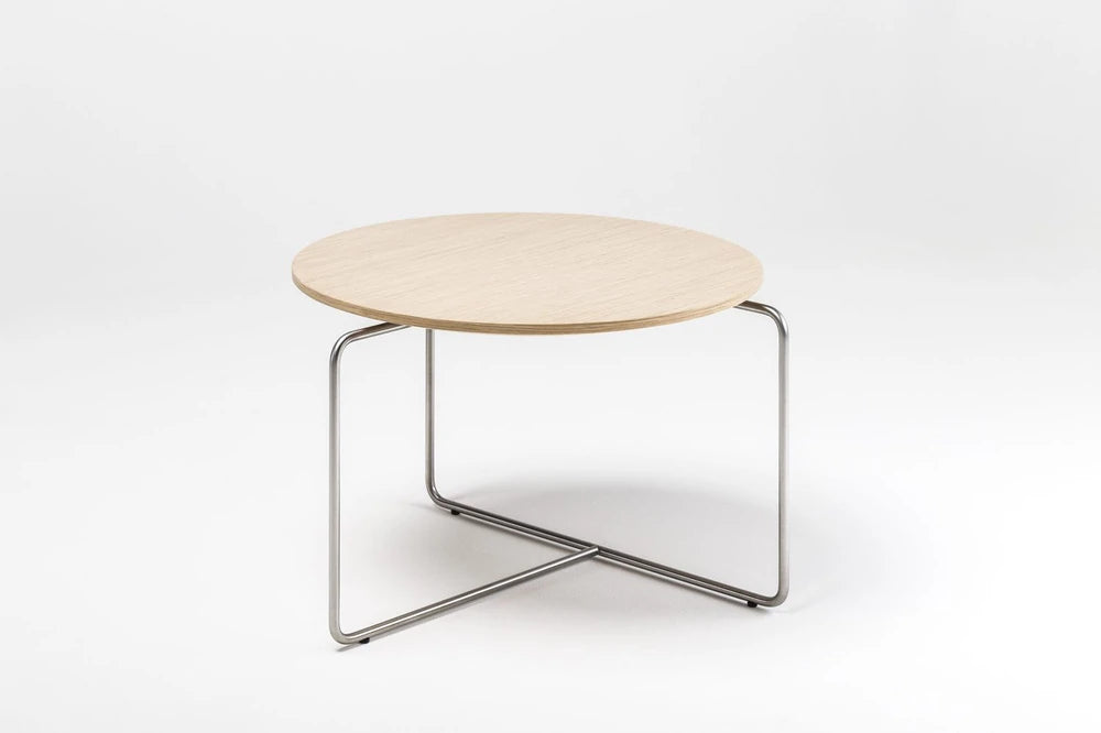 Collection of tables with characteristic oval edges of the table top combined with a square Sectional frame varnished in black or grey. Table top is covered with modified oak veneer in three colours: milk, coffee or cocoa.