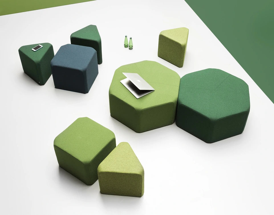 x40 is a family of for pouffes with polygonal bases. The seats have been designed on triangular, square, hexagonal and octagonal plans. The element shared by all the solids is a rectangle with rounded corners, 40 cm in width. Thanks to identical sides, the pouffes can be placed in a variety of arrangements. Based on this distinctive repetitive quality and the broad range of fabric colours, users are able to try out a variety of arrangement possibilities. The basic structural elements are styrofoam profiles covered with polyurethane foam. As a result, the pouffes are very lightweight and can be rearranged as often as you please. The x40 family is an excellent choice for furnishing public utilities and modern residential interiors.